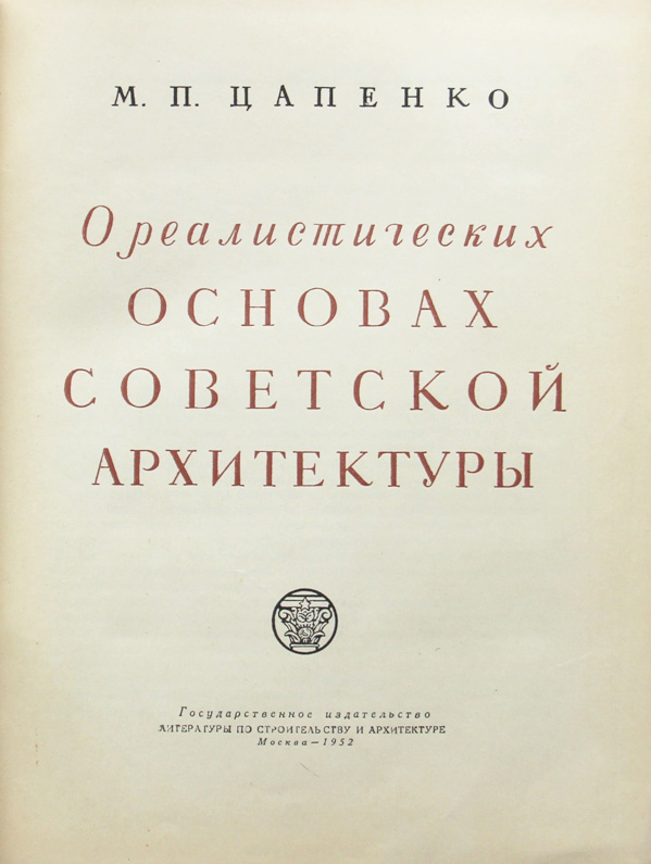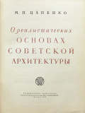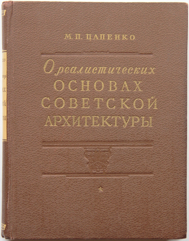 Цапенко М.Н. О реалистических основах советской архитектуры. М.: Государственное издательство литературы по строительству и архитектуре, 1952. 392, [4] с., с илл. 21,7 х 16,7 см. Оформление книги художника Б.Б.Титова. В издательском переплете. Отличная сохранность.