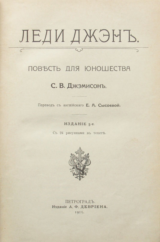 Джэмисон С.В. Леди Джэн: Повесть для юношества. Перевод с английскаго Е.А.Сысоевой. Издание 5-е. С 24 рисунками в тексте. Пг., издание А.Ф.Девриена, 1915. [6], 258 с., с илл. 22 х 15 см. В иллюстрированном издательском переплете с золотым и цветным тиснением на корешке и передней крышке. Очень хорошая сохранность.