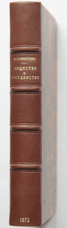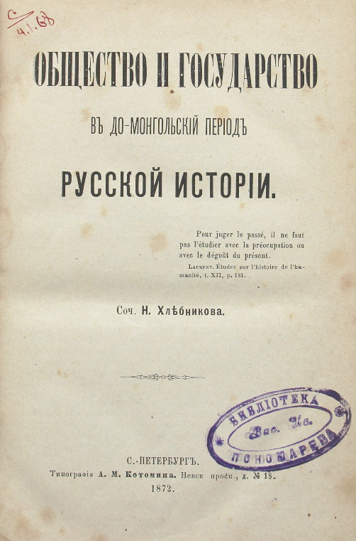 Хлебников Н. Общество и государство в до-монгольский период русской истории. Спб., типография А.М.Котомина, 1872. [10], XXII, 512, [5] с. 20,3 х 13 см. В современном полукожаном переплете. Очень хорошая сохранность. На титуле и авантитуле дореволюционный владельческий штамп: «Библиотека Вас. Ив. Пономарева».