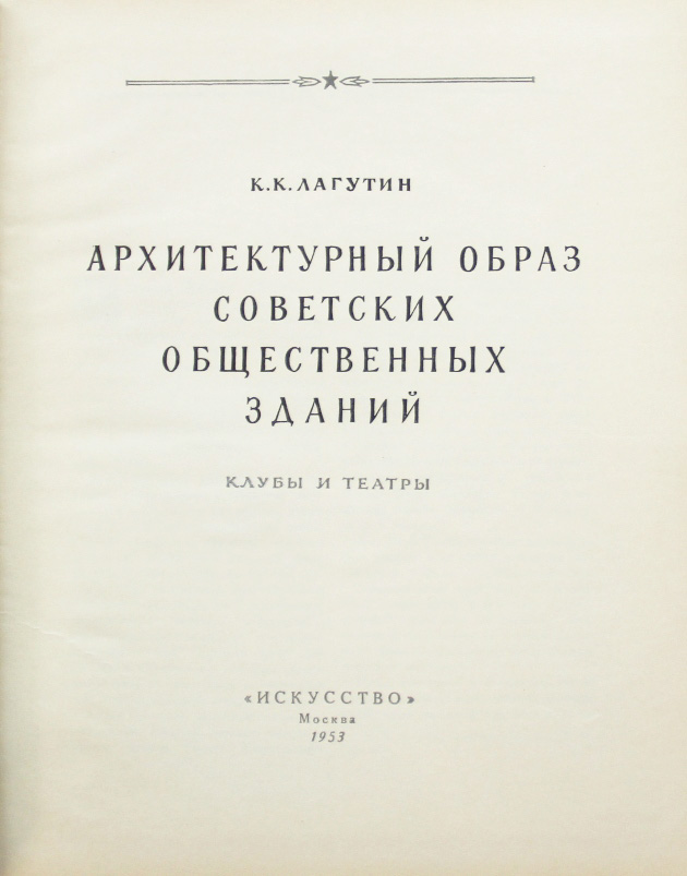 Лагутин К.К. Архитектурный образ советских общественных зданий: Клубы и театры. М.: Искусство, 1953. 234, [2] с., с илл. 25,9 х 20,5 см. Тираж 8000 экз. В издательском переплете. Отличная сохранность.