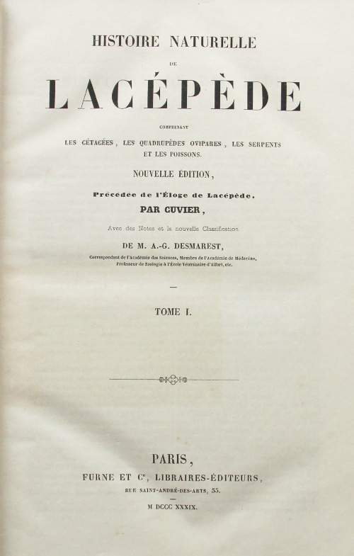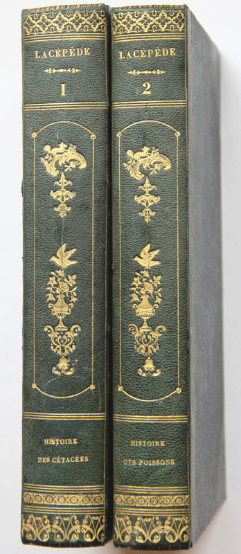 Lacepede. Histoire naturelle comprenant les cetacees, les quadrupedes ovipares, les serpents et les poissons. Nouvelle edition precedee de L'Eloge de Lacepede par Cuvier. Avec des notes et la nouvelle classification de M.-A.-G. Desmarest. Paris, Furne et C-ie, 1839. - Ласепед. Естественная история земноводных, рыб и пресмыкающихся. Новое издание. 2 тома. Париж, 1839. 26 x 16,3 см. В двух полукожаных переплетах эпохи с золотым тиснением на корешках. Очень хорошая сохранность. Издание иллюстрировано гравюрами на меди, профессионально раскрашенными акварелью; раскраска соответствует времени издания. На переднем форзаце каждого тома ярлык антикварного магазина «Librairie Laurencier. Bordeaux».