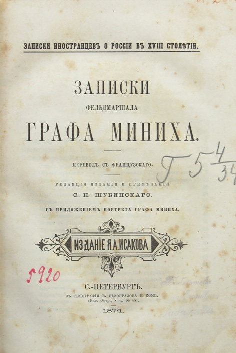 Миних Б.-Х. Записки фельдмаршала графа Миниха. Перевод с французскаго. Редакция издания и примечания С.Н.Шубинскаго. С приложением портрета графа Миниха. Спб., издание Я.А.Исакова, 1874. XXX, 406 c.; 1 л. портр. 18,9 x 13,1 см. Первое русское издание, вышедшее через 100 лет после прижизненного издания на французском языке. Книга выпущена в серии «Записки иностранцев о России в XVIII столетии», Т. 2. В современном полукожаном переплете. Сохранена издательская обложка. Очень хорошая сохранность. На передней обложке, обратной стороне портрета и на титульном листе владельческие штампы: «Библиотека Ивана Егоровича Забелина».