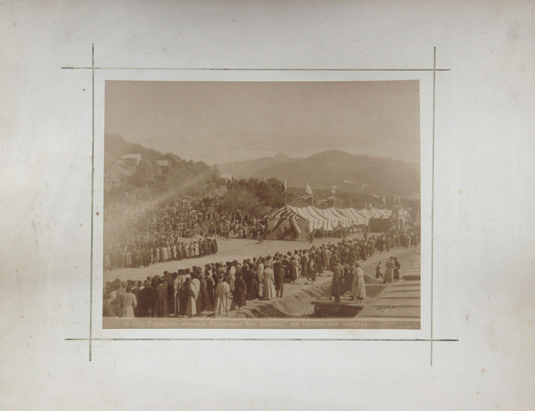 На одной из фотографий запечатлено высокое начальство на торжественном открытии тоннеля. В центре фотографии - министр путей сообщения А.Я.Гюббенет, которого вскоре сменил на посту С.Ю.Витте, а также начальник гражданской администрации Кавказа граф С.А.Шереметев. Кроме того, на фотографиях зафиксирован вид торжественного завтрака для администрации и инженеров, обзор тоннельного входа и выхода, а также несколько общих видов окрестностей тоннеля с придорожными сооружениями. Фотографии были выполнены известными кавказскими фотографами - А.К.Энгелем и Д.И.Ермаковым. Профессиональная деятельность Д.И.Ермакова как фотографа началась в Тифлисе в 1860-е г.г. Большое количество фотографий Д.И.Ермакова посвящено Кавказу, Турции, Персии.