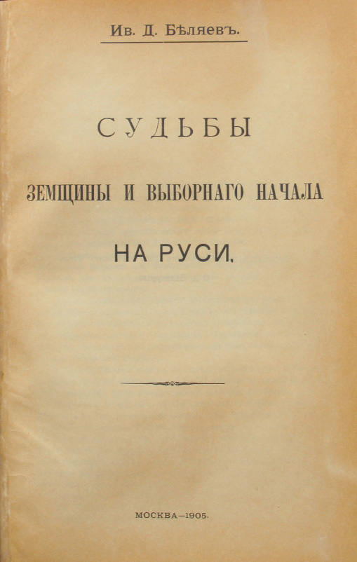 Беляев И.Д. Судьбы земщины и выборнаго начала на Руси. М., [издание Императорского Общества истории и древностей российских при Московском университете], 1905. VI, 7-136 с. 25 х 16 см. Отдельный оттиск работы И.Д.Беляева, изданный МОИДР под наблюдением С.А.Белокурова. В современном полукожаном переплете. Отличная сохранность. Редкость.