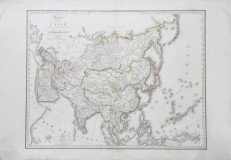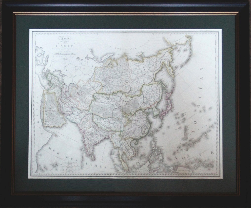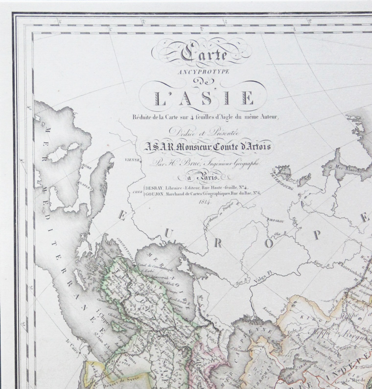 Carte Аncyprotype de L'Asie. Réduite de la Carte sur 4 feuilles d’Aigle du méme Auteur, Dédiée & Présentée A S.A.R. Monsieur Comte d'Artois. Par H.Brué, Injénieur Géographe. A Paris, chez Desray, Goujon, 1814. - Карта Азии. Уменьшенная версия карты на 4 листах того же автора. Посвященная и подаренная его светлости господину графу Д'Артуа. Автор: Ю.Брюэ, Инженер-Географ. Париж, у Десрея, Гужона, 1814. Карта, гравированная на меди, в современном паспарту и в раме. Подкраска границ акварелью соответствует времени издания. Размеры оттиска: 54,5 х 70,5 см. Размеры в раме: 77,5 х 93,5 см. Отличная сохранность.