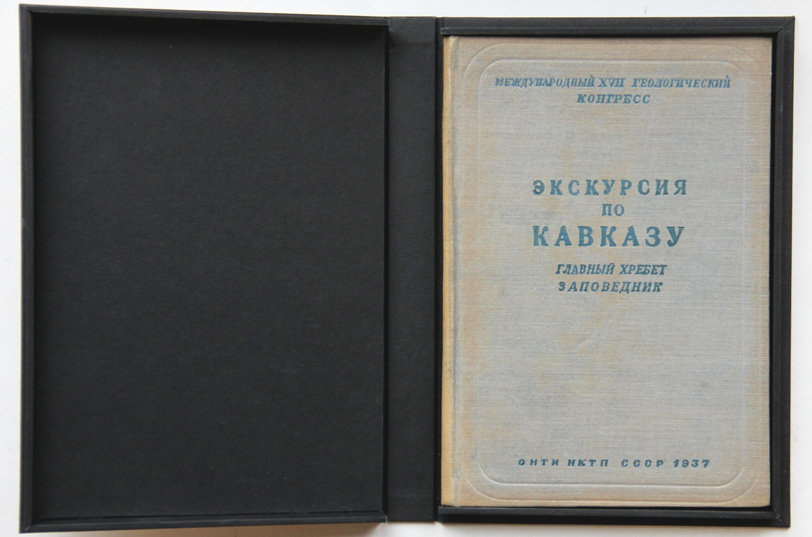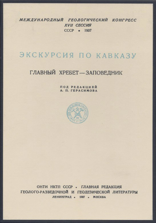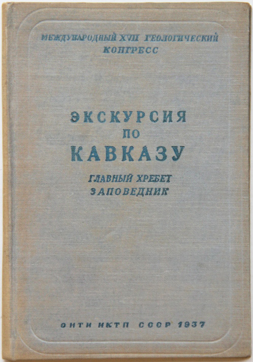 Экскурсия по Кавказу: Главный хребет. - Заповедник. Под редакцией А.П.Герасимова. Л.-М.: ОНТИ НКТП СССР - Главная редакция геолого-разведочной и геодезической литературы, 1937. 66 с., с илл.; 4 л. илл. и карт. 19,2 х 13 см. Тираж 2000 экз. Вышла в серии «Международный Геологический конгресс. XVII сессия». В издательском переплете и в современном художественном футляре. Отличная сохранность. На переднем форзаце владельческий экслибрис.