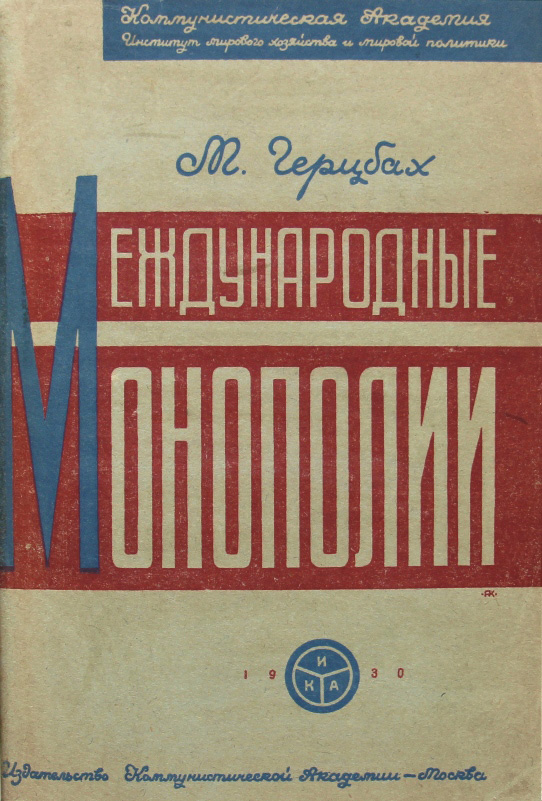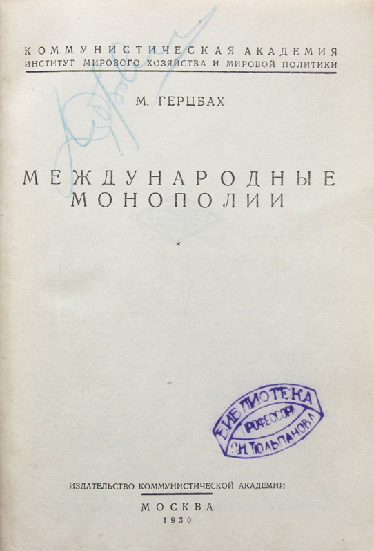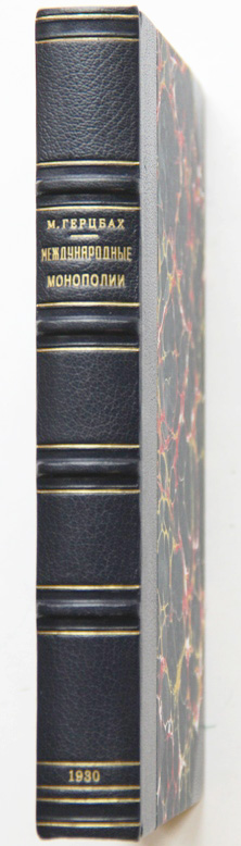 Герцбах М. Международные монополии. М.: издательство Коммунистической Академии, 1930. 367, [2] с. 21 х 14,5 см. Книга впоследствии не переиздавалась. В современном полукожаном переплете. Сохранена издательская обложка работы художника А.Кречика. Отличная сохранность. На титульном листе владельческая подпись и штамп-экслибрис: «Библиотека профессора С.И.Тюльпанова».