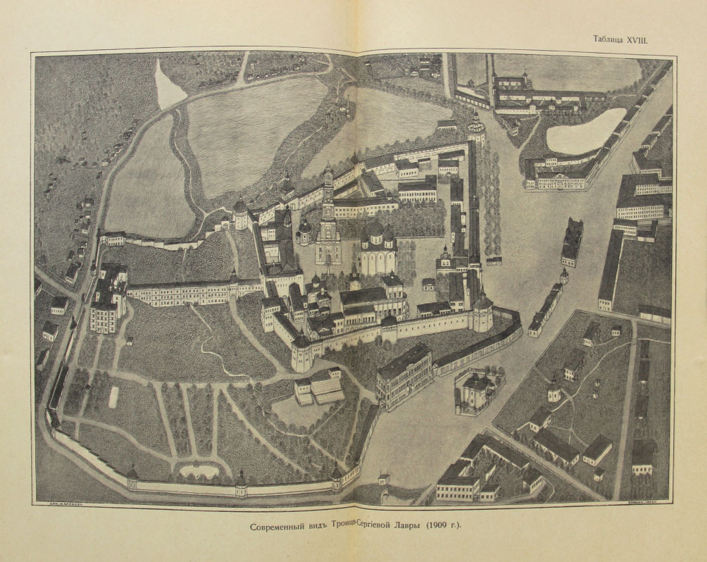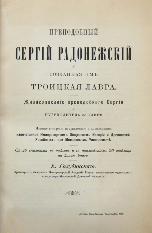 Голубинский Е. Преподобный Сергий Радонежский и созданная им Троицкая Лавра: Жизнеописание преподобнаго Сергия и путеводитель по Лавре. Издание второе, исправленное и дополненное, напечатанное Императорским Обществом Истории и Древностей Российских при Московском Университете. С 36 снимками в тексте и с приложением 20 таблиц на конце книги. М., Синодальная типография, 1909. VI, 424 с., с илл.; 20 л. табл. 26 x 17 см. В современном цельнокожаном переплете с золотым тиснением на корешке и крышках, муаровые форзацы. Сохранена издательская обложка. Отличная сохранность. Страницы 97-108 пронумерованы дважды, далее продолжается правильная пагинация.