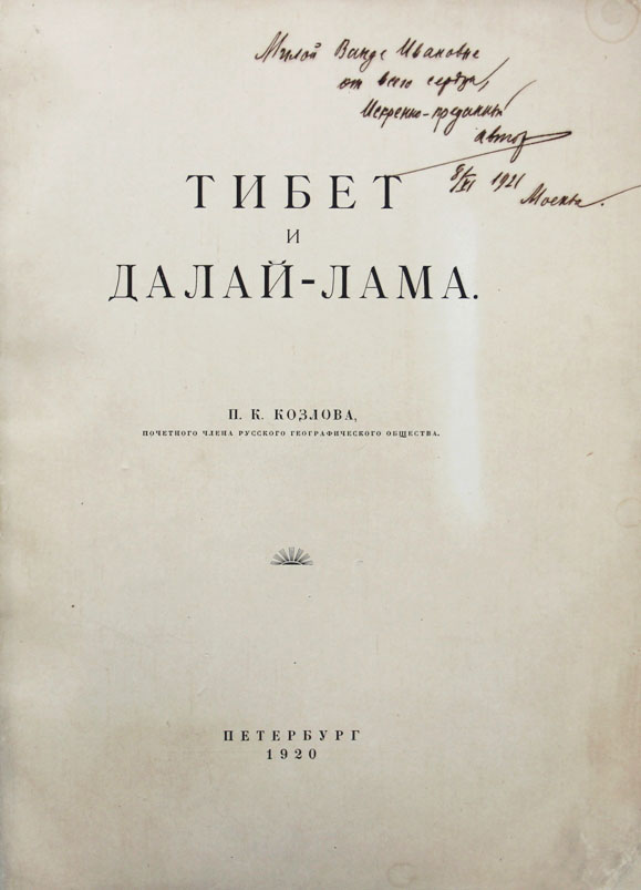 Козлов П.К. Тибет и Далай-Лама. Пб., [15-ая Государственная типография], 1920. 100 с.; с илл. в тексте и 9 илл. на отдельных листах. 28,7 х 21 см. В современном полукожаном переплете. Сохранена издательская обложка. Очень хорошая сохранность. Профессиональная реставрация обложки. На титульном листе автограф автора: «Милой Ванде Ивановне от всего сердца, Искренно-преданный автор. 8/VI 1921 Москва».