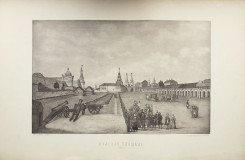 Красная площадь составляет одну из древнейших частей Китай-города. Гравюра Ф.Гильфердинга «Красная площадь в Москве» является важным историческим и художественным документом эпохи. Кремль еще сохраняет здесь черты крепости: у Алевизова рва видны земляные укрепления, возведенные в петровское время в связи со шведской угрозой. Вдоль него в строгом порядке выстроен ряд пушек. Восстановленная после пожара 1773 г. архитектором И.Мичуриным Никольская башня имеет еще барочное оформление. Справа - старые одноэтажные торговые ряды. В глубине - здание Главной аптеки и шатровые завершения Воскресенских ворот.
