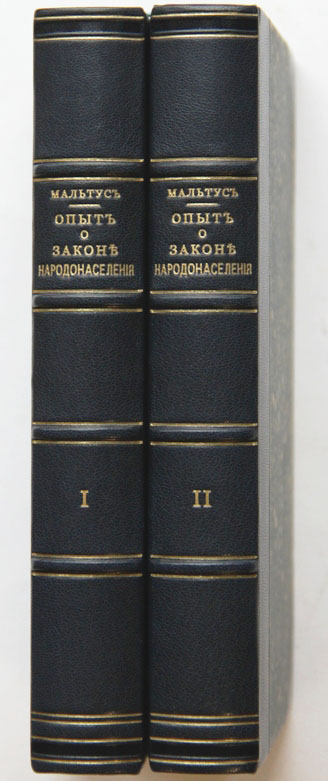Мальтус Т.Р. Опыт о законе народонаселения или изложение прошедшаго и настоящаго действия этого закона на благоденствие человеческаго рода, с приложением нескольких изследований о надежде на отстранение или смягчение причиняемаго им зла. Перевел П.А.Бибиков. 2 тома. Спб., в типографии И.И.Глазунова, 1868. 21,3 х 14 см. Первое русское издание. В двух современных полукожаных переплетах. Сохранены издательские обложки. Отличная сохранность. Профессиональная реставрация обложек.