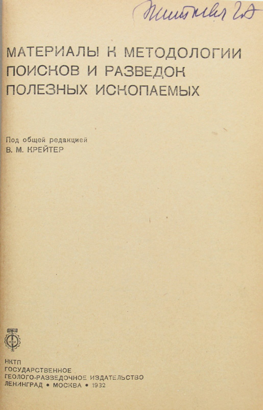 Материалы к методологии поисков и разведок полезных ископаемых. Под общей редакцией В.М.Крейтер. Л.-М.: НКТП - Государственное геолого-разведочное издательство, 1932. 552, [2] с., с илл.; 3 л. табл. 22 х 14,5 см. Тираж 6100 экз. В современном полукожаном переплете. Отличная сохранность. На титульном листе владельческая подпись.