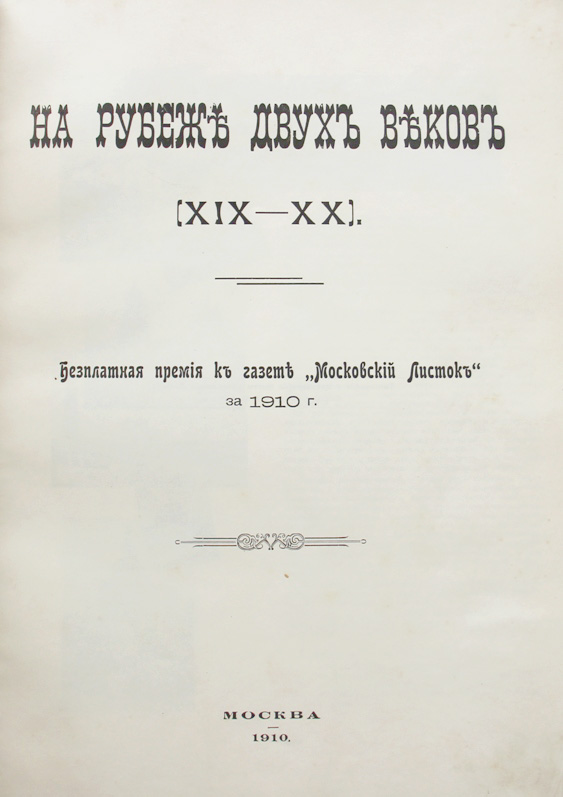 [Москва]: На рубеже двух веков (XIX-XX). Безплатная премия к газете «Московский Листок» за 1910 г. М., [типография и цинкография газеты «Московский Листок»], 1910. 176 с., с илл. 33,5 х 24,7 см. В современном полукожаном переплете с золотым тиснением на корешке. Сохранена цветная хромолитографированная издательская обложка. Очень хорошая сохранность.