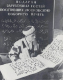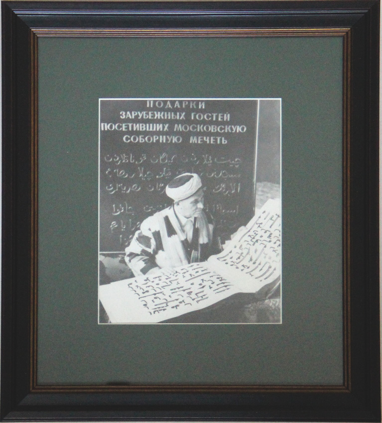 Наставник московских мусульман имам-хатыб Московской Соборной мечети Ахметзян Мустафин за чтением Корана Османа. [М.], 1960-е г.г. Оригинальная фотография в современном паспарту и раме. Размер снимка: 20 х 16 см. Размер в раме: 38 х 34 см. Отличная сохранность.