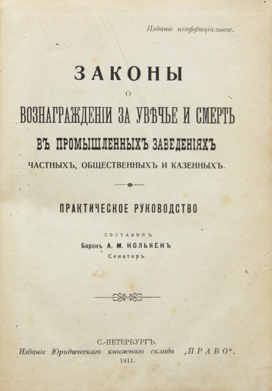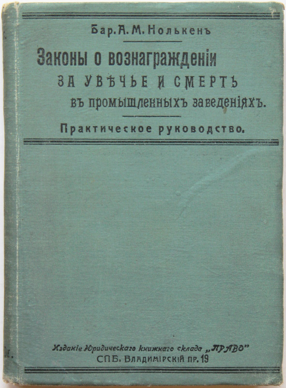 Нолькен А.М. Законы о вознаграждении за увечье и смерть в промышленных заведениях частных, общественных и казенных: Практическое руководство. Спб., издание Юридическаго книжнаго склада «Право», 1911. VIII, [2], 372, [2] с. 21,5 х 15,5 см. В издательском переплете. Очень хорошая сохранность. На переднем форзаце владельческая подпись.