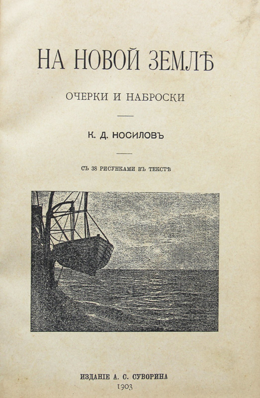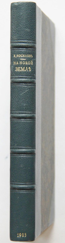 Носилов К.Д. На Новой Земле: Очерки и наброски. С 38 рисунками в тексте. [Спб.], издание А.С.Суворина, 1903. [4], 327, [2] с., с илл. 22,7 х 15,3 см. В современном полукожаном переплете. Сохранена издательская обложка. Очень хорошая сохранность. На передней обложке, авантитуле и с. 1 дореволюционный штамп Офицерской библиотеки Съемки Юго-Западного пограничного пространства.