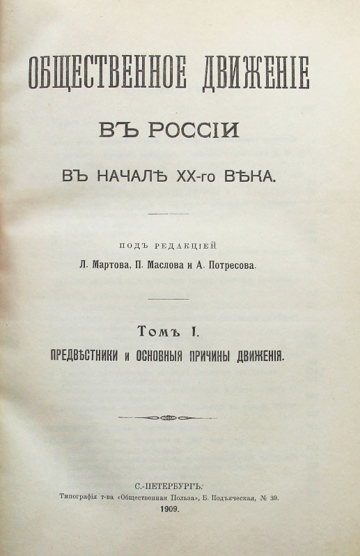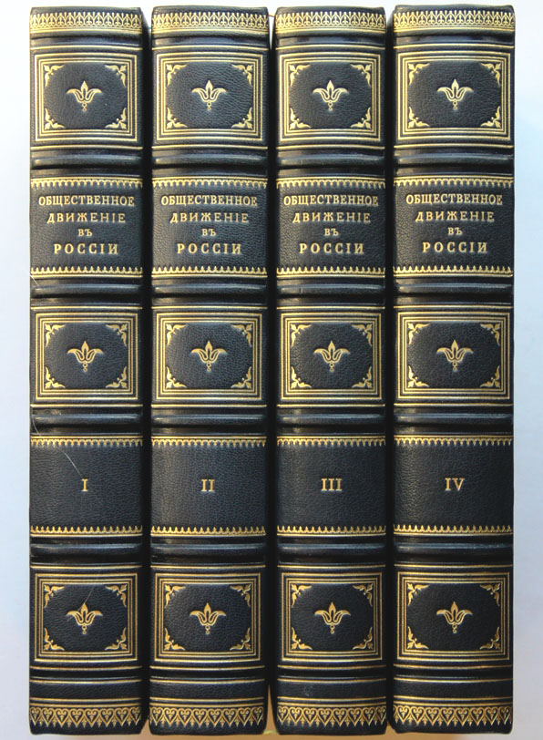 Общественное движение в России в начале XX-го века. Под редакцией Л.Мартова, П.Маслова и А.Потресова. 4 тома. Спб., типография т-ва «Общественная Польза», 1909-1914. 26,3 x 17 см. В четырех современных полукожаных переплетах с золотым тиснением на корешках. Сохранены издательские обложки. Отличная сохранность.