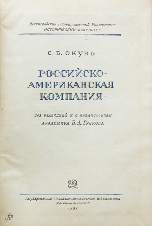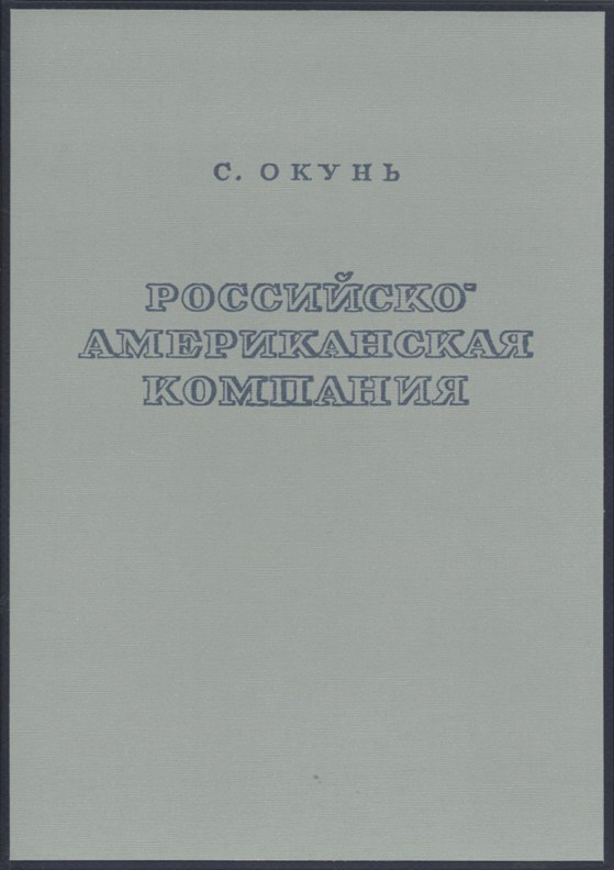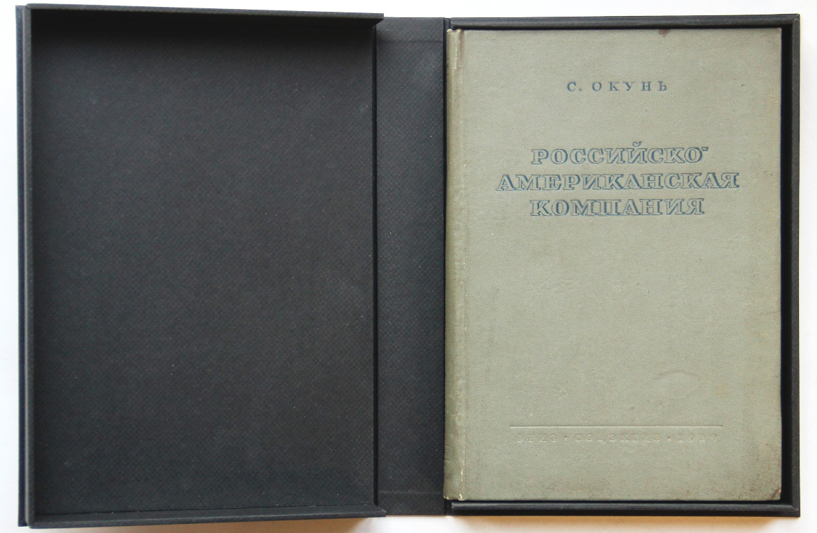 Окунь С.Б. Российско-американская компания. Под редакцией и с предисловием академика Б.Д.Грекова. М.-Л.: Государственное Социально-экономическое издательство, 1939. 258, [2] с., с илл. 20,2 х 14 см. Тираж 5000 экз. Издание докторской диссертации исследователя. Книга вышла под грифом: «Ленинградский Государственный Университет. Исторический факультет». В издательском переплете и в современном художественном футляре. Хорошая сохранность.