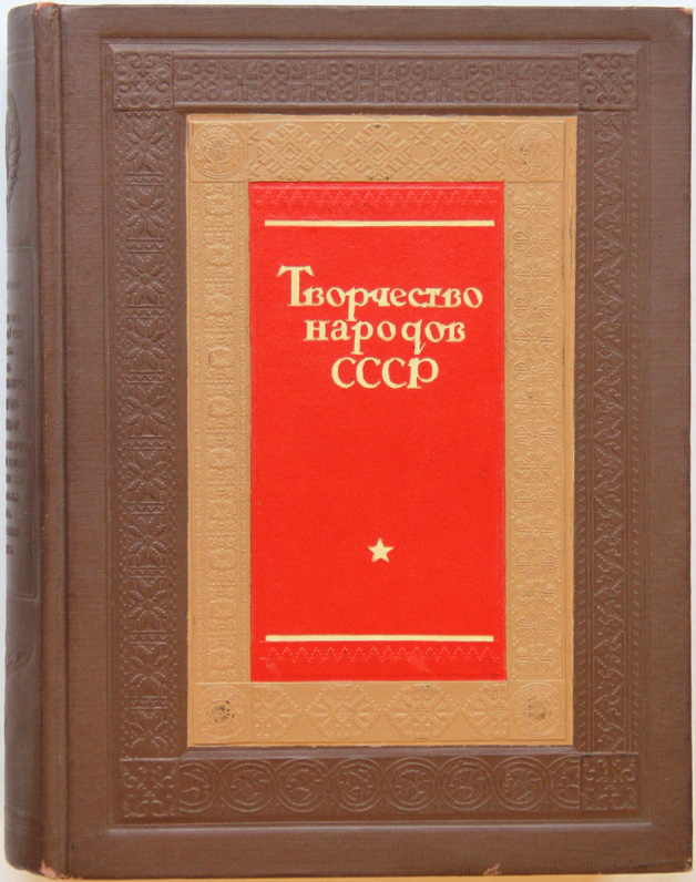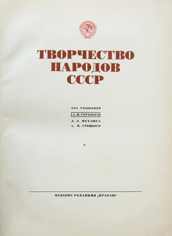 Творчество народов СССР. Под редакцией А.М.Горького, Л.З.Мехлиса, А.И.Стецкого. [М.], издание редакции «Правды», [1937]. XII, 534, [2] с.; 44 л. илл. 27 х 20 см. Юбилейное издание к 20-летию Октябрьской революции. В издательском переплете. Очень хорошая сохранность.