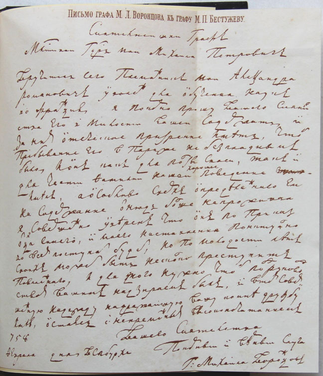 Графский род Воронцовых в течение XVIII-XIX вв. дал России плеяду выдающихся государственных деятелей: канцлер Российской империи Михаил Илларионович Воронцов (1714-1767); его племянник Александр Романович Воронцов (1741-1805), дипломат, сенатор, президент Коммерц-коллегии, с 1801 г. - государственный канцлер; младший брат Александра Романовича - Семен Романович Воронцов (1744-1832), который был русским послом в Англии с 1785 по 1806 г.; наконец, сын С.Р.Воронцова - Михаил Семенович (1782-1856), новороссийский генерал-губернатор и наместник Бессарабии, с 1844 г. кавказский наместник. «Архив князя Воронцова» представляет собой многотомное издание документов, принадлежавших графам (а с 1845 г. князьям) Воронцовым, под редакцией П.И.Бартенева. Оно содержит огромный материал, касающийся важнейших сюжетов русской и европейской истории. В переписке и других документах архива освещены военные, внешне- и внутриполитические, культурно-исторические события первостепенного значения, раскрывается их суть и тайные пружины. Издатель архива - Петр Иванович Бартенев (1829-1912), выдающийся российский историк, библиограф и археограф. Он окончил историко-филологическое отделение Московского университета, затем работал в московском архиве, а с 1859 г. заведовал московской публичной библиотекой Черткова. Сфера его деятельности была чрезвычайно широка и разнообразна. В частности, он был издателем фундаментального «Русского архива» - издания, которое вышло в 598 томах и включило в себя огромный массив важнейших документов по русской истории. Публикация документов семейного архива графов и князей Воронцовых началась в 1870 г. по заказу Семена Михайловича Воронцова, сына и наследника М.С.Воронцова. Князь принимал в ней «личное, постоянное участие». Издание Архива продолжалось 25 лет и закончилось в 1895 г. П.И.Бартенев осуществлял разбор и описание документов семейного архива параллельно с их публикацией. У издателя не было четкого плана, он издавал документы, руководствуясь результатами своих поисков. Историк стремился соблюдать хронологический и тематический принципы в систематизации и публикации документов. Материалы издавались на языке оригинала (в основном - французском), без переводов. Сравнительно малая часть документов - на русском языке и небольшое количество на других европейских языках. «Архив князя Воронцова» без всяких преувеличений можно назвать бесценным и не потерявшим актуальности по сей день источником. Среди бумаг широко представлены письма и распоряжения царей, дипломатическая, секретная корреспонденция, перлюстрация писем известных политических деятелей. Вот лишь некоторые темы и массивы документов, получившие отражение и опубликованные в «Архиве». Управление хозяйством Елизаветы Петровны; 34 письма дипломата и литератора князя Антиоха Дмитриевича Кантемира за 1742-1744 гг.; 26 писем принцессы Цербстской Иоанны Елизаветы (матери императрицы Екатерины II) к графу М.Л.Воронцову с приложениями за 1744-1759 гг. (кн. 1). Переписка по делу Б.К.Миниха и Э.И.Бирона (кн. 2). Бумаги, касающиеся покушения на жизнь императрицы Елизаветы Петровны (книга 3). Документы, освещающие конференцию графа М.Л.Воронцова с иностранными послами в царствование Петра III, 1762 г.; черновые записки о конференции графа М.Л.Воронцова с иностранными министрами с 6 июля 1762 г. по 9 января 1763 г.; переписка графа М.Л.В
