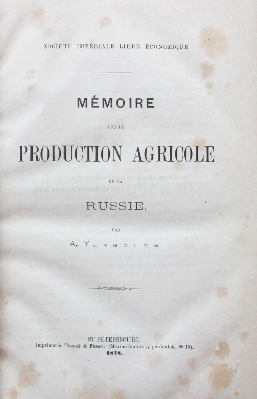 Yermolow A. Memoire sur la Production Agricole de la Russie. Spb., Societe Imperiale Libre Economique, 1878. - Ермолов А. Записки о развитии сельского хозяйства в России. Спб., Императорское Вольное экономическое общество, 1878. VIII, 208 с. 24,8 х 16 см. В полукожаном переплете эпохи. Очень хорошая сохранность. На переднем форзаце гравированный экслибрис: «Woburn Abbey 1873».