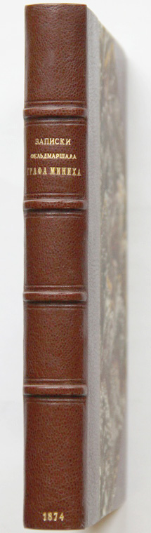 Миних Б.-Х. Записки фельдмаршала графа Миниха. Перевод с французскаго. Редакция издания и примечания С.Н.Шубинскаго. С приложением портрета графа Миниха. Спб., издание Я.А.Исакова, 1874. XXX, 406 c.; 1 л. портр. 18,9 x 13,1 см. Первое русское издание, вышедшее через 100 лет после прижизненного издания на французском языке. Книга выпущена в серии «Записки иностранцев о России в XVIII столетии», Т. 2. В современном полукожаном переплете. Сохранена издательская обложка. Очень хорошая сохранность. На передней обложке, обратной стороне портрета и на титульном листе владельческие штампы: «Библиотека Ивана Егоровича Забелина».