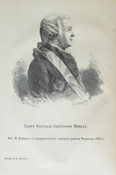 Граф Бурхард-Христофор Миних (1683-1767) - генерал-фельдмаршал, сын тайного советника. Отец, заведовавший плотинами в графстве Ольденбургском, специалист по фортификации и гидравлике, дал сыну отличное воспитание, поручал ему копировать планы, чертежи, читать описания плотин и шлюзов. Б.-Х.Миних - профессиональный военный, готовый служить тому государю, который больше заплатит.