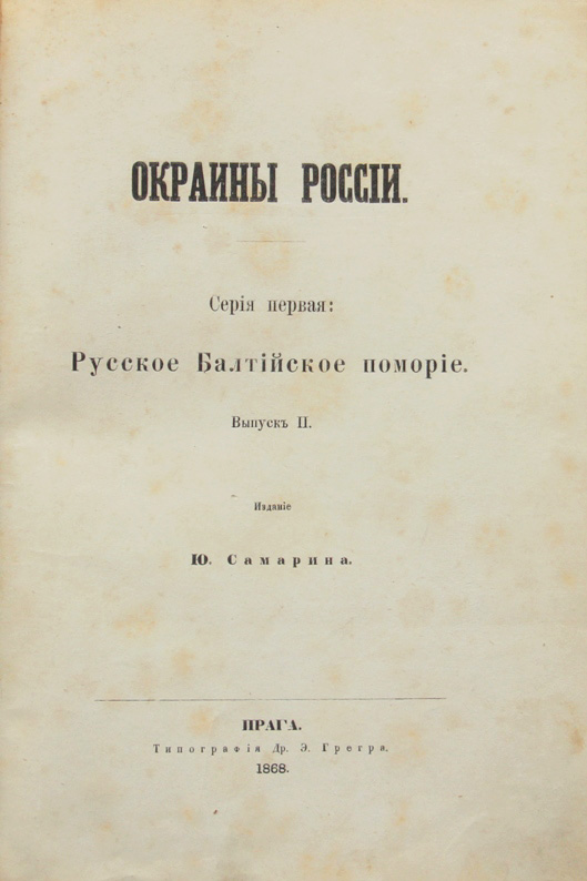 Окраины России. Серия первая: Русское Балтийское поморие. Выпуск II. [Записки православнаго латыша Индрика Страумита. (1840-1845)]. Издание Ю.Самарина. Прага, типография Др.Э.Грегра, 1868. VIII, 133, [5] с. 22,5 х 15,2 см. Первое издание. В полукожаном переплете эпохи. Очень хорошая сохранность. Книга впоследствии не переиздавалась, до 1894 г. была запрещена к распространению в России. Редкость.