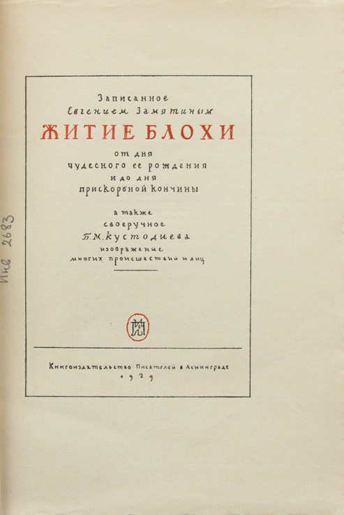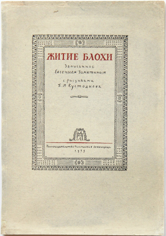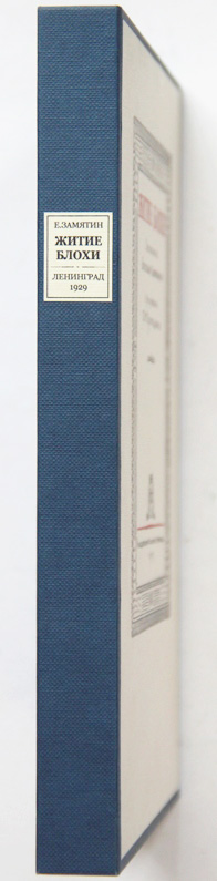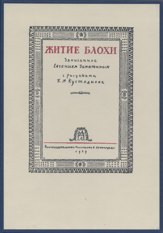 Замятин Е. Записанное Евгением Замятиным Житие блохи от дня чудесного ее рождения и до дня прискорбной кончины а также своеручное Б.М.Кустодиева изображение многих происшествий и лиц. Л.: Книгоиздательство писателей в Ленинграде, 1929. 37 с., с илл. 19,6 х 13,7 см. Тираж 500 экз. В издательской обложке и в современном художественном футляре. Профессиональная реставрация обложки. Очень хорошая сохранность. Обложка и титульный лист работы М.А.Кирнарского. Пародийный портрет Е.И.Замятина (Замутия, епископа Обезьянского) и 6 иллюстраций выполнены художником Б.М.Кустодиевым. Редкое библиофильское издание.