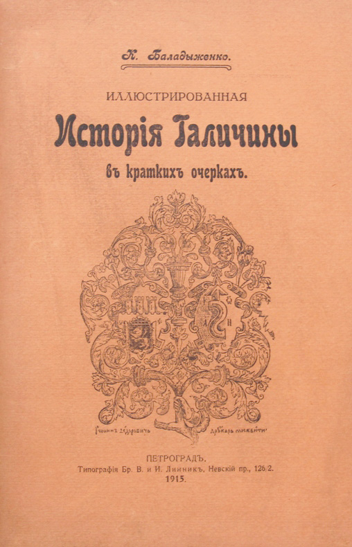 Баладыженко К. Иллюстрированная История Галичины в кратких очерках. С 60-ью рисунками. Пг., [типография Бр. В. и И. Линник], 1915. 99, [4] с., с илл. 23 х 15 см. В современном полукожаном переплете. Сохранена издательская обложка. Отличная сохранность. На титульном листе дарственная надпись: «Многоуважаемому Всеволоду Васильевичу от авторов. П.Г. и К.Ш.».