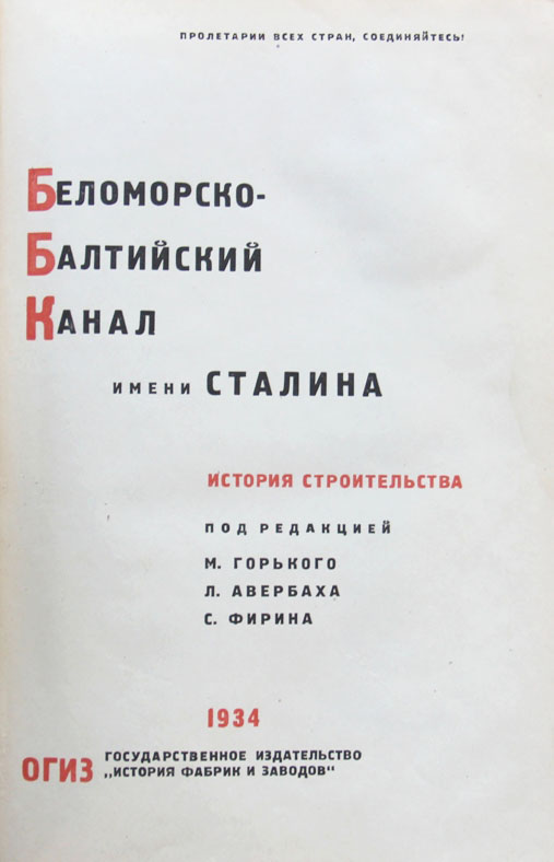 Беломорско-Балтийский канал имени Сталина: История строительства. Под редакцией М.Горького, Л.Л.Авербаха, С.Г.Фирина. [М.]: История фабрик и заводов, 1934. 614, [2] с., с илл.; 1 л. портр. 22,5 х 14,5 см. Подбор иллюстраций и оформление книги производились бригадой под руководством А.Тихонова. Состав бригады: М.Бабенчиков, Ж.Гаузнер, Н.Дмитриев, Н.Ильин, А.Лемберг, А.Родченко, А.Тихонов, Я.Янош. Переплет, титульные листы и шмуц-титула - Н.Ильина. Карта работы художников: А.Дейнека, Е.Мачальской, Я.Яноша. На передней крышке барельеф И.В.Сталина работы художника-скульптора П.Таежного. В издательском переплете. Хорошая сохранность. В экземпляре сохранен обычно уничтожавшийся портрет Г.Г.Ягоды.