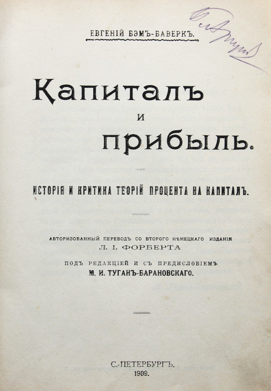 Бэм-Баверк Е. Капитал и прибыль: История и критика теорий процента на капитал. Авторизованный перевод со второго немецкаго издания Л.И.Форберта. Под редакцией и с предисловием М.И.Туган-Барановскаго. Спб., [типография А.Г.Розена], 1909. [2], VIII, [2], 644 с. 20,8 х 15 см. Первое русское издание. В современном полукожаном переплете. Отличная сохранность.