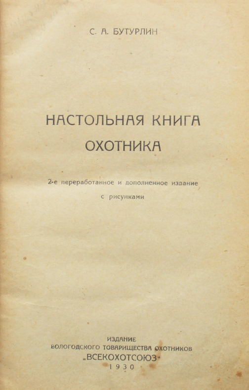 Бутурлин С.А. Настольная книга охотника. 2-е переработанное и дополненное издание с рисунками. Вологда, издание Вологодского товарищества охотников «Всекохотсоюз», 1930. 351, III с., с илл. 21,2 х 13,7 см. В современном полукожаном переплете с золотым тиснением на корешке. Отличная сохранность.