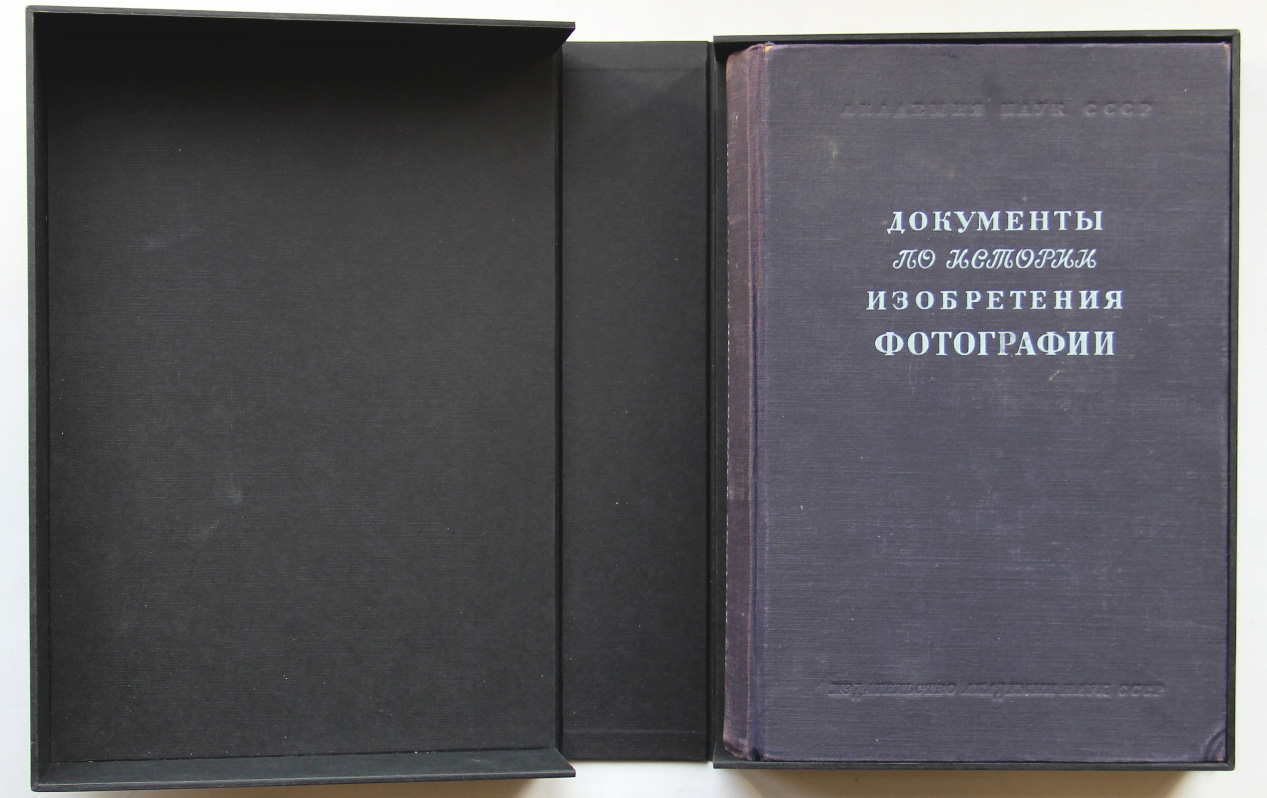 Документы по истории изобретения фотографии: Переписка Ж.Н.Ниепса, Ж.М.Дагерра и других лиц. Редакция и вводная статья члена-корреспондента АН СССР Т.П.Кравца. М.-Л.: издательство Академии наук, 1949. 510 с.; 11 л. илл. 25,3 х 16,5 см. Тираж 3000 экз. Запрещенное издание. В издательском переплете и в современном художественном футляре. Очень хорошая сохранность. Редкость.