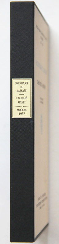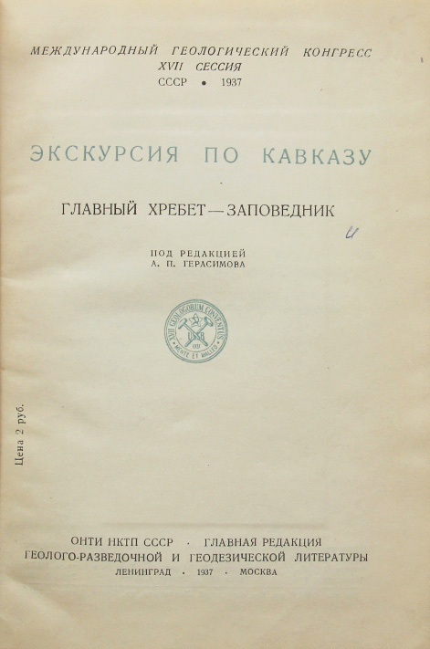Экскурсия по Кавказу: Главный хребет. - Заповедник. Под редакцией А.П.Герасимова. Л.-М.: ОНТИ НКТП СССР - Главная редакция геолого-разведочной и геодезической литературы, 1937. 66 с., с илл.; 4 л. илл. и карт. 19,2 х 13 см. Тираж 2000 экз. Вышла в серии «Международный Геологический конгресс. XVII сессия». В издательском переплете и в современном художественном футляре. Отличная сохранность. На переднем форзаце владельческий экслибрис.