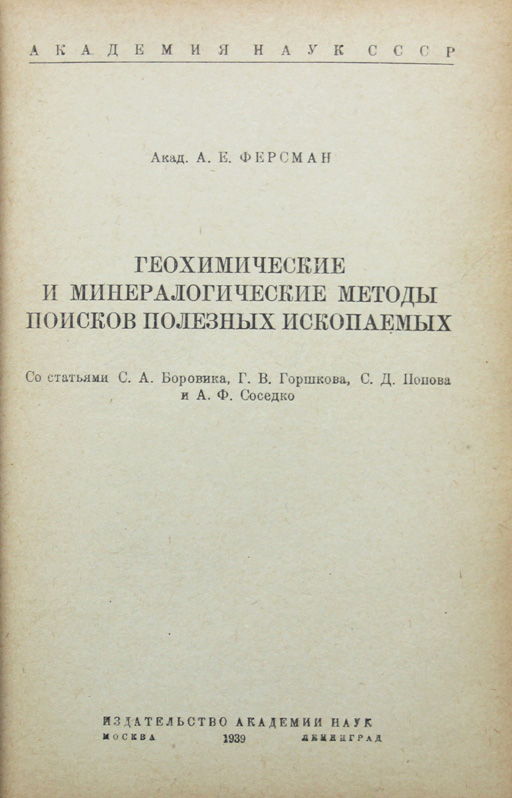 Ферсман А.Е., акад. Геохимические и минералогические методы поисков полезных ископаемых. Со статьями С.А.Боровика, Г.В.Горшкова, С.Д.Попова и А.Ф.Соседко. М.-Л.: издательство Академии наук, 1939. 446, [2] с., с илл.; 2 л. табл. 21,5 х 13,8 см. Тираж 4000 экз. Первое издание. В современном полукожаном переплете. Отличная сохранность.