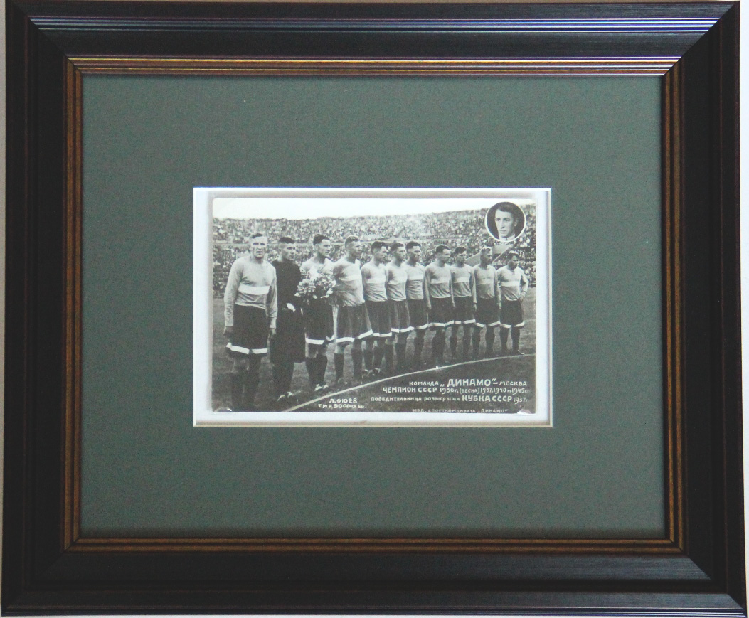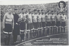На снимке представлена команда московского «Динамо» во время своего знаменитого турне по Великобритании. Внизу снимка подпись: «Команда «Динамо» - Москва. Чемпион СССР 1936 г. (весна) 1937, 1940 и 1945 г.г. Победительница розыгрыша Кубка СССР 1937 г.». Фотография была издана спорткомбинатом «Динамо» в рекламных целях тиражом 90000 экз. В верхнем правом углу врезка с портретом главного тренера команды М.И.Якушина.