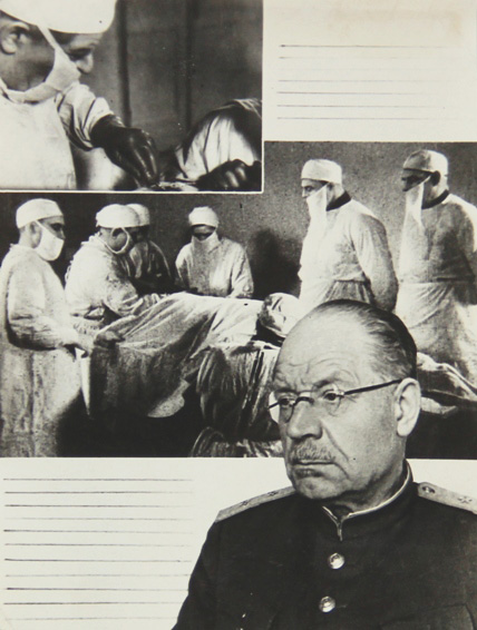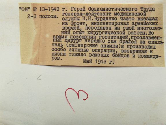 Фотография была опубликована в № 13 журнала «Фронтовая иллюстрация» в мае 1943 г. На обороте фотографии наклеен текст, который сопровождал снимок при публикации: «"ФИ" № 13-1943 г. 2-3 полосы. Герой Социалистического Труда генерал-лейтенант медицинской службы Н.Н.Бурденко часто выезжал на фронт, инспектировал армейских врачей, передавал им свой многолетний опыт хирургической работы. Во время посещения госпиталей, прославленный хирург нередко сам брался за скальпель (см. верхние снимки) и производил особо сложные операции, возвращая к жизни тяжело раненых бойцов и командиров. Май 1943 г.».