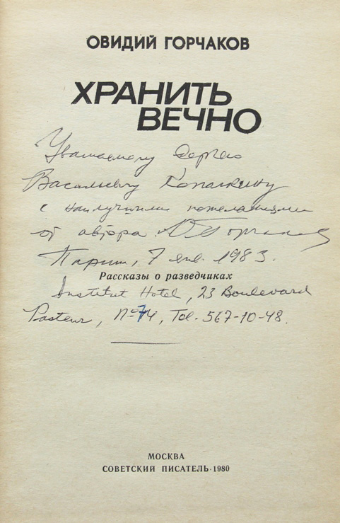 Горчаков О. Хранить вечно: Рассказы о разведчиках. М.: Советский писатель, 1980. 302, [2] с., с илл. 19,7 х 12,5 см. В иллюстрированном издательском переплете. Отличная сохранность. На титульном листе автограф автора: «Уважаемому Сергею Васильевичу Копалкину с наилучшими пожеланиями от автора. О.Горчаков. Париж, 7 янв. 1983. Institut Hotel, 23 Boulevard Pasteur, № 74, Tel. 567-10-48».