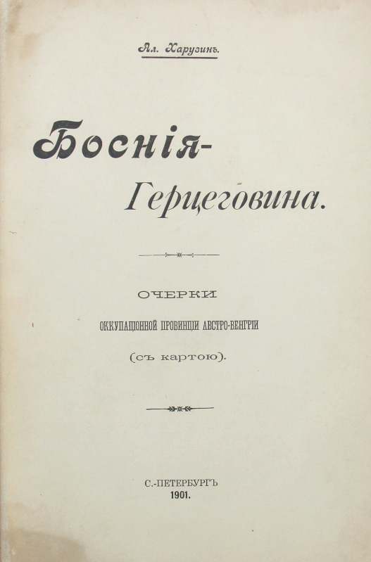 А.Н.Харузин со студенческих лет ездил в экспедиции в разные уголки страны от Русского географического общества и Общества любителей естествознания, изучал историю и этнологию народов Средней Азии и Прибалтики. В конце 1890-х г.г. в творчестве А.Н.Харузина возникает славянская тема. В декабре 1899 г. действительный член Императорского Русского Географического общества А.Н.Харузин подал заявление, прося «нравственной и материальной поддержки» для поездки в Далмацию, Боснию, Герцеговину и Черногорию. Ученый приводит мотивацию необходимости такой командировки. Главным основанием он считает то, что в русской науке, в отличие от европейской, после работ А.Ф.Гильфердинга не появлялось фундаментального исследования о Боснии и Герцеговине. Кроме того, А.Н.Харузин доказывал научную и политическую актуальность изучения оккупированной провинции тем, что такое исследование может прояснить ситуацию в самой России: «судьба балканских славян, стоящих на рубеже двух культурных миров: «западного» и «восточного», не лишена аналогии с судьбою нашего отечества». Русское Географическое общество одобрило поездку, которая состоялась в 1900 г., а уже в 1901 г. работа А.Н.Харузина «Босния-Герцеговина. Очерки оккупационной провинции Австро-Венгрии» вышла в свет.