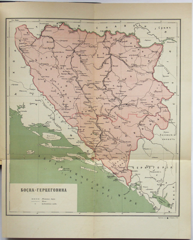 Харузин Ал. Босния-Герцеговина: Очерки оккупационной провинции Австро-Венгрии. (С картою). Спб., [Государственная типография], 1901. [2], II, III, 4-305 c.; 1 карта. 25,8 х 16,8 см. Малотиражное издание на особой бумаге. В современном полукожаном переплете. Отличная сохранность. Аккуратные владельческие пометы карандашом в тексте. Редкость.