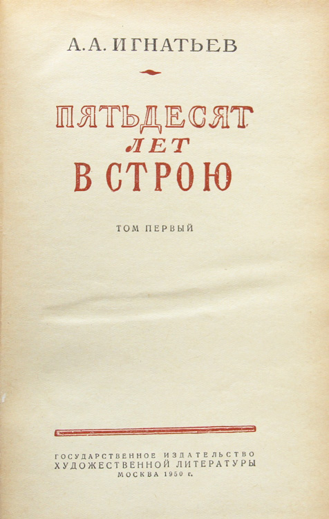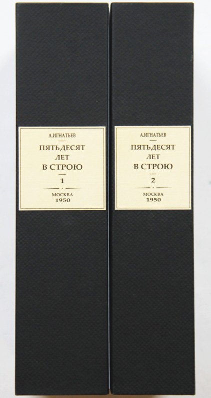 Игнатьев А.А. Пятьдесят лет в строю. 2 тома. М.: Государственное издательство художественной литературы, 1950. 19,8 х 13 см. В издательских переплетах и в современных художественных футлярах. Хорошая сохранность. На передних форзацах обоих томов автографы автора: «Глубокоуважаемому Евгению Александровичу и прелестной Тамаре Вячеславовне Беркаловым в знак лучших чувств к ним дружбы. Автор Алексей Игнатьев. 1951 г.», «"Для того чтобы ценить настоящее, нужно знать прошлое, а для того, чтобы верить в будущее, нужно знать настоящее!". А.И. От всей души друзьям Беркаловым. Автор А.Игнатьев».