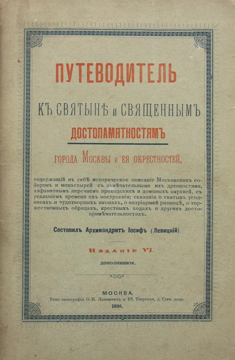 Иосиф (Левицкий), архим. Путеводитель к святыне и священным достопамятностям гор. Москвы и ея окрестностей, содержащий в себе историческое описание Московских соборов и монастырей с замечательными их древностями, алфавитным перечнем приходских и домовых церквей, с указанием времени их построения; сказания о святых угодниках и чудотворных иконах, о патриаршей ризнице, о торжественных обрядах, крестных ходах и других достопримечательностях. Издание наследников, дополненное. М., Типо-Литография О.И.Лашкевич и К, 1896. VIII, 288 c., с илл. 19,5 x 13 см. В современном полукожаном переплете с золотым тиснением на корешке. Сохранена издательская обложка. Очень хорошая сохранность.