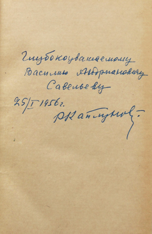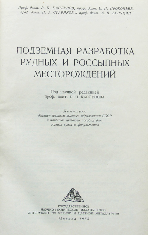 Каплунов Р.П., Прокопьев Е.П., Стариков Н.А., Бричкин А.В. Подземная разработка рудных и россыпных месторождений. Под научной редакцией проф. докт. Р.П.Каплунова. М.: Металлургиздат, 1955. 680 с., с илл. 21 х 13,5 см. Тираж 8000 экз. В современном полукожаном переплете. Отличная сохранность. На авантитуле дарственная надпись: «Глубокоуважаемому Василию Андриановичу Савельеву. 25/I 1956 г. Р.Каплунов».