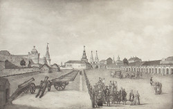 Красная площадь составляет одну из древнейших частей Китай-города. Гравюра Ф.Гильфердинга «Красная площадь в Москве» является важным историческим и художественным документом эпохи. Кремль еще сохраняет здесь черты крепости: у Алевизова рва видны земляные укрепления, возведенные в петровское время в связи со шведской угрозой. Вдоль него в строгом порядке выстроен ряд пушек. Восстановленная после пожара 1773 г. архитектором И.Мичуриным Никольская башня имеет еще барочное оформление. Справа - старые одноэтажные торговые ряды. В глубине - здание Главной аптеки и шатровые завершения Воскресенских ворот.
