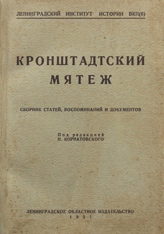 Кронштадтский мятеж: Сборник статей, воспоминаний и документов. Под редакцией Н.Корнатовского. Л.: Ленинградское областное издательство, 1931. 264 с. 20,5 х 15 см. В современном полукожаном переплете. Сохранена издательская обложка. Очень хорошая сохранность.