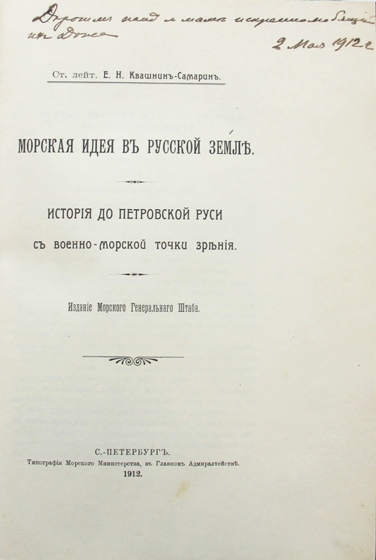 Квашнин-Самарин Е.Н., ст. лейт. Морская идея в русской земле: История до петровской Руси с военно-морской точки зрения. Спб., типография Морского Министерства, 1912. [2], 189 с. 26 х 18 см. В современном полукожаном переплете. Сохранена издательская обложка. Отличная сохранность. На титульном листе автограф автора: «Дорогим папе и маме искренне любящий их Дожа. 2 Мая 1912 г.».