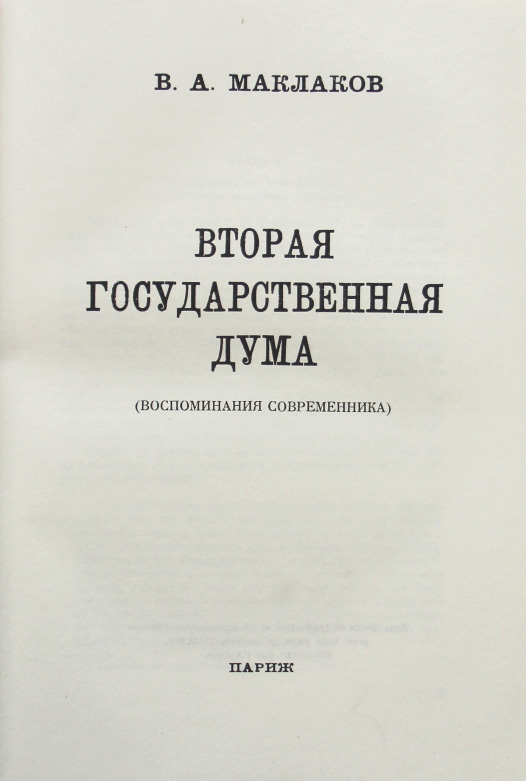 Маклаков В.А. Вторая Государственная Дума. (Воспоминания современника). Париж, [1936]. 258, [4] с. 22,6 x 15,7 см. В современном полукожаном переплете. Сохранена издательская обложка. Отличная сохранность.