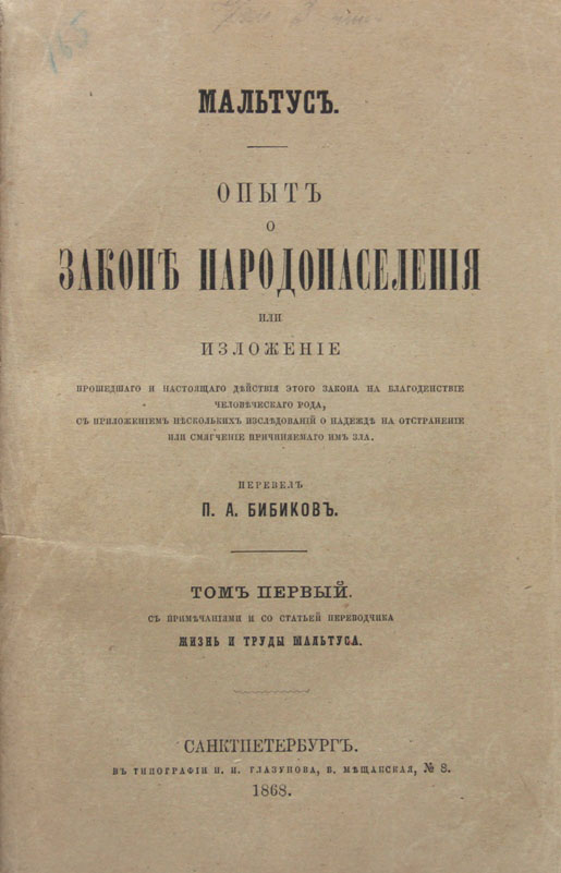 Т. 1. С примечаниями и со статьей переводчика «Жизнь и труды Мальтуса». 476 с.