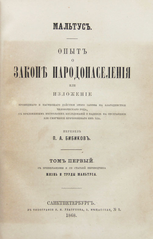 Мальтус Т.Р. Опыт о законе народонаселения или изложение прошедшаго и настоящаго действия этого закона на благоденствие человеческаго рода, с приложением нескольких изследований о надежде на отстранение или смягчение причиняемаго им зла. Перевел П.А.Бибиков. 2 тома. Спб., в типографии И.И.Глазунова, 1868. 21,3 х 14 см. Первое русское издание. В двух современных полукожаных переплетах. Сохранены издательские обложки. Отличная сохранность. Профессиональная реставрация обложек.